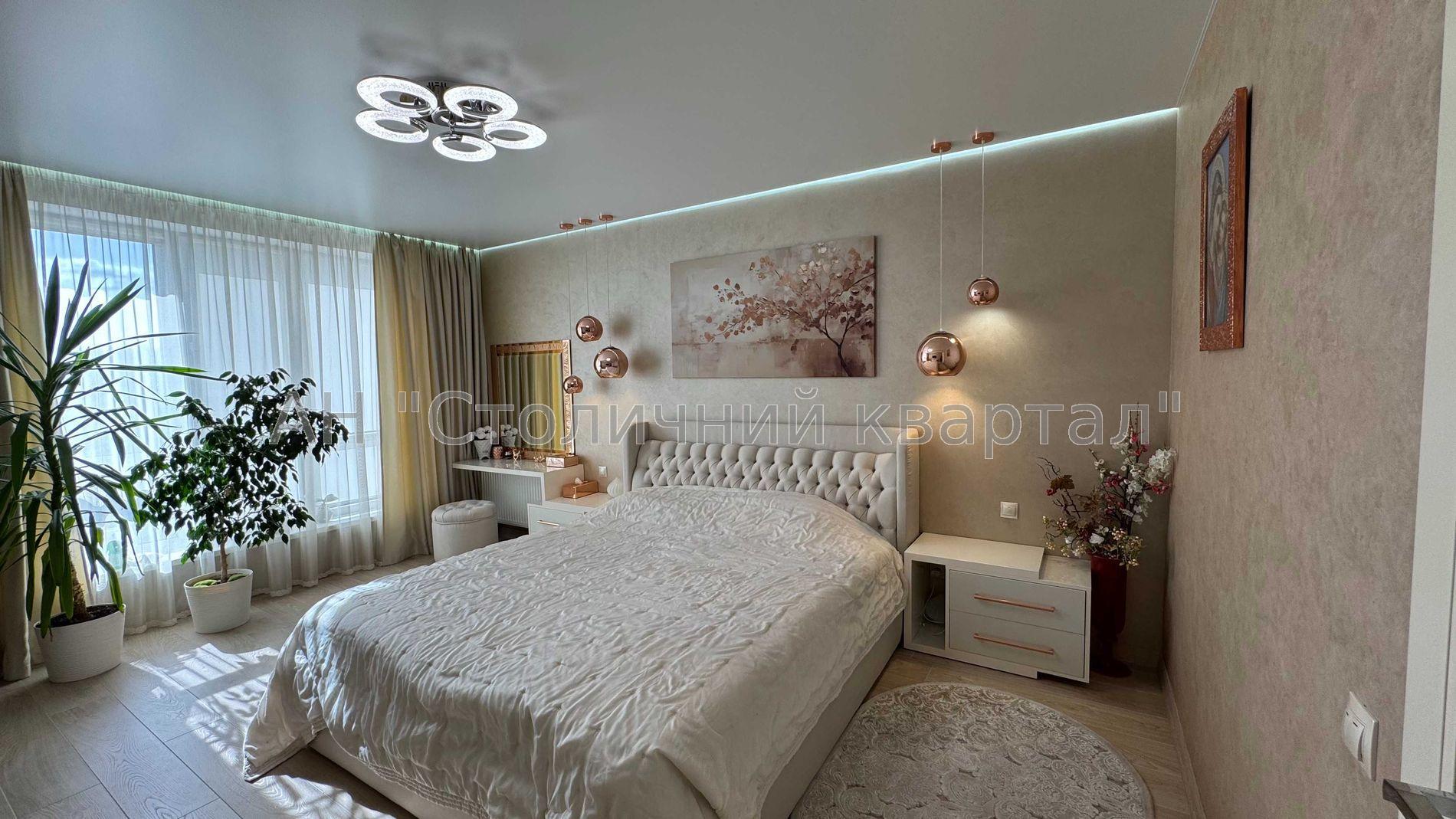 Чотирикімнатна квартира з авторським ремонтом в ЖК Кришталеві Джерела в самому гарному місці Києва, біля парку Феофанія. Загальна площа 112 кв.м, 5/9 поверх. Продається з усіма меблями, телевізорами, пральною/сушильною машиною і всією технікою для кухні. 2 великі санвузли, тепла підлога.