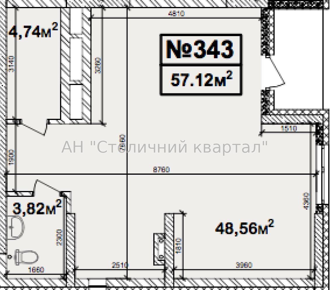 - Загальна площа приміщення – 57,12 м2 вільного планування